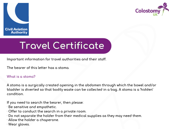 - Get a free stoma travel certificate from Colostomy UK. It explains your condition to airport staff but needs to be signed by a GP to be considered valid. You can download one here.